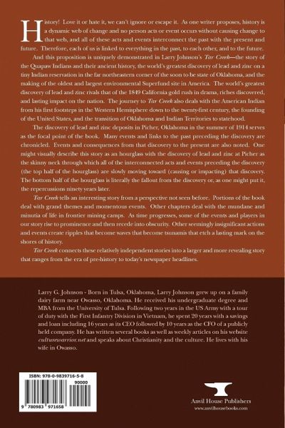 Tar Creek - A History of The Quapaw Indians, the World's Largest Lead and Zinc Discovery, and The Tar Creek Superfund Site. When this book was conceived, it was intended as a straightforward recounting of the story of the world's greatest discovery of lead and zinc located in the far northeast corner of Oklahoma. I soon realized that this 1915 discovery was strongly linked to prior as well as current events and that those events should be a part of the story. Because of the interconnectedness of the present with the past, the story grew and quickly encompassed the Quapaw Indians and their ancient history, the founding of the United States, the Louisiana Purchase, the transition of Oklahoma and Indian Territories to statehood, the discovery and mining of lead and zinc in the Tri-State region, and the making of the oldest and largest environmental Superfund site in America. This book does not claim to do justice to any of these topics but attempts to tell an interesting story from a perspective not seen before. Parts of the book deal with grand themes and momentous events. Other chapters deal with the mundane and minutia of life in frontier mining camps. As time progresses, some of the events and players in our story rise to prominence and then recede into obscurity. Other seemingly insignificant actions and events create ripples that become waves that become tsunamis that etch a lasting mark on the shores of history. The discovery of lead and zinc deposits in 1915 on the Quapaw Reservation at Picher, Oklahoma, serves as the focal point of the book. Several events and links to the past preceding the discovery are chronicled. Events and actions from that discovery to the present are also noted. One might visually describe this story as an hourglass with the discovery of lead and zinc at Picher as the skinny neck through which all of the interconnected acts and events preceding the discovery (the top half of the hourglass) are slowly moving toward (causing or impacting) that discovery. The bottom half of the hourglass is literally the fallout from the discovery or, as one might put it, the repercussions ninety years later. Larry G. Johnson