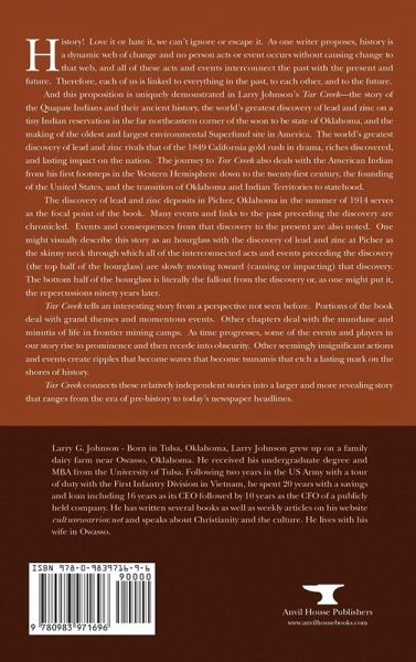 Tar Creek – A History of The Quapaw Indians, the World’s Largest Lead and Zinc Discovery, and The Tar Creek Superfund Site. When this book was conceived, it was intended as a straightforward recounting of the story of the world’s greatest discovery of lead and zinc located in the far northeast corner of Oklahoma. I soon realized that this 1915 discovery was strongly linked to prior as well as current events and that those events should be a part of the story. Because of the interconnectedness of the present with the past, the story grew and quickly encompassed the Quapaw Indians and their ancient history, the founding of the United States, the Louisiana Purchase, the transition of Oklahoma and Indian Territories to statehood, the discovery and mining of lead and zinc in the Tri-State region, and the making of the oldest and largest environmental Superfund site in America. This book does not claim to do justice to any of these topics but attempts to tell an interesting story from a perspective not seen before. Parts of the book deal with grand themes and momentous events. Other chapters deal with the mundane and minutia of life in frontier mining camps. As time progresses, some of the events and players in our story rise to prominence and then recede into obscurity. Other seemingly insignificant actions and events create ripples that become waves that become tsunamis that etch a lasting mark on the shores of history. The discovery of lead and zinc deposits in 1915 on the Quapaw Reservation at Picher, Oklahoma, serves as the focal point of the book. Several events and links to the past preceding the discovery are chronicled. Events and actions from that discovery to the present are also noted. One might visually describe this story as an hourglass with the discovery of lead and zinc at Picher as the skinny neck through which all of the interconnected acts and events preceding the discovery (the top half of the hourglass) are slowly moving toward (causing or impacting) that discovery. The bottom half of the hourglass is literally the fallout from the discovery or, as one might put it, the repercussions ninety years later. Larry G. Johnson