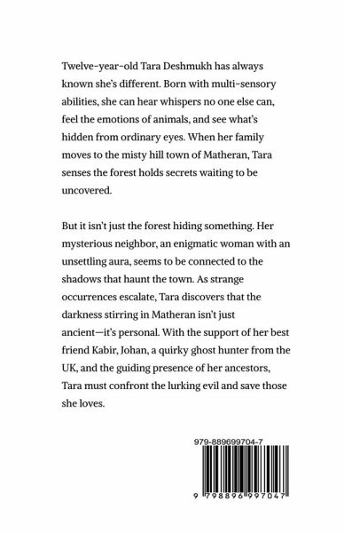 Twelve-year-old Tara Deshmukh has always known she's different. Born with multi-sensory abilities, she can hear whispers no one else can, feel the emotions of animals, and see what's hidden from ordinary eyes. When her family moves to the misty hill town of Matheran, Tara senses the forest holds secrets waiting to be uncovered. But it isn't just the forest hiding something. Her mysterious neighbor, an enigmatic woman with an unsettling aura, seems to be connected to the shadows that haunt the town. As strange occurrences escalate, Tara discovers that the darkness stirring in Matheran isn't just ancient-it's personal. With the support of her best friend Kabir, Johan, a quirky ghost hunter from the UK, and the guiding presence of her ancestors, Tara must confront the lurking evil. In a race against time, Tara must harness her unique powers and uncover the truth about Matheran's past. Can she outwit the darkness, or will the shadows consume everything she loves? Blending mystery, supernatural thrills, and a touch of humor, Tara and the Shadows of Matheran is a captivating tale of bravery, friendship, and self-discovery.