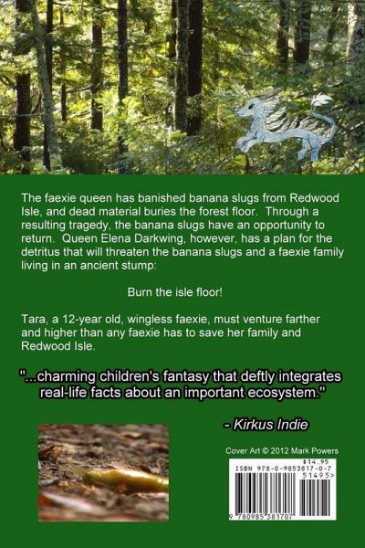 The faexie queen has banished banana slugs from Redwood Isle, and dead material buries the forest floor. Through a resulting tragedy, the banana slugs have an opportunity to return. Queen Elena Darkwing, however, has a plan for the detritus that will threaten the banana slugs and a faexie family living in an ancient stump: Burn the isle floor! Tara, a 12-year old, wingless faexie, must venture farther and higher than any faexie has to save her family and Redwood Isle.