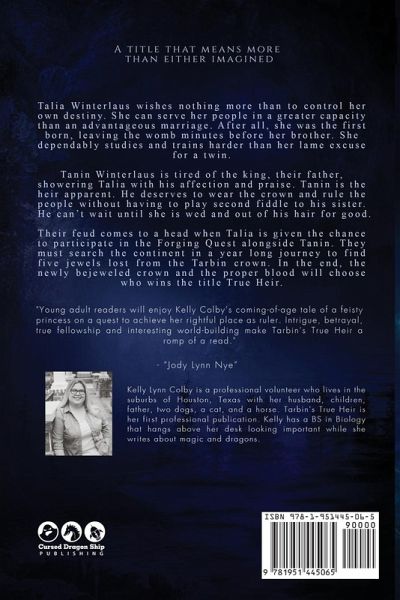 Talia Winterlaus wishes nothing more than to control her own destiny. She longs to serve her people to a greater extent than a politically advantageous marriage. After all, she was the first born, leaving the womb minutes before her brother. She dependably studies and trains harder than her lame excuse for a twin. Tanin Winterlaus is tired of the king, their father, showering Talia with his affection and praise. Tanin is the heir apparent. He deserves to wear the crown and rule the people without having to play second fiddle to his sister. He can't wait until she is wed and out of his hair for good. Their feud comes to a head when Talia is given the chance to participate in the Forging Quest alongside Tanin. They must search the continent in a year long journey to find five jewels lost from the Tarbin crown. In the end, the newly bejeweled crown and the proper blood will choose who wins the title True Heir. A title that means more than either imagined.