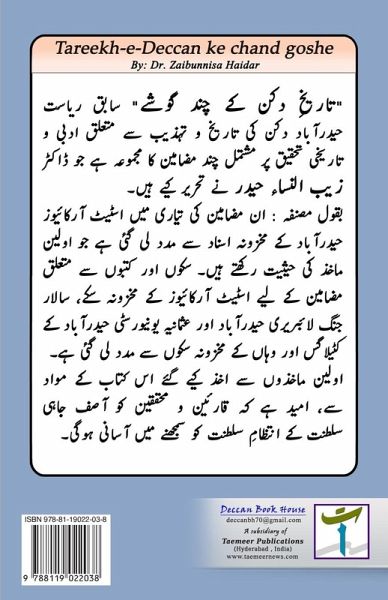 "Tareekh-e-Deccan ke chand goshe" is a collection of essays containing literary and historical research on the history and Culture of the erstwhile state of Hyderabad Deccan, written by Dr. Zaibunnisa Haidar. Since the content of this book has been derived from primary sources, readers and researchers will find it easy to understand the administration of the Asif Jahi Dynasty. "¿¿¿¿¿¿ ¿¿¿ ¿¿ ¿¿¿ ¿¿¿¿" ¿¿¿¿ ¿¿¿¿¿ ¿¿¿¿¿¿¿¿ ¿¿¿ ¿¿ ¿¿¿¿¿ ¿ ¿¿¿¿¿ ¿¿ ¿¿¿¿¿ ¿¿¿¿ ¿ ¿¿¿¿¿¿ ¿¿¿¿¿ ¿¿ ¿¿¿¿¿ ¿¿¿ ¿¿¿¿¿¿ ¿¿ ¿¿¿¿¿¿ ¿¿ ¿¿ ¿¿¿¿¿ ¿¿¿ ¿¿¿¿¿¿ ¿¿¿¿ ¿¿ ¿¿¿¿¿ ¿¿¿ ¿¿¿¿ ¿¿¿¿¿ ¿¿¿¿¿¿ ¿¿ ¿¿¿ ¿¿¿ ¿¿¿ ¿¿ ¿¿¿¿ ¿¿ ¿¿¿¿ ¿¿¿ ¿¿¿¿¿¿ ¿ ¿¿¿¿¿¿ ¿¿ ¿¿¿ ¿¿¿¿ ¿¿¿¿¿ ¿¿ ¿¿¿¿¿¿¿ ¿¿¿¿¿ ¿¿ ¿¿¿¿¿¿ ¿¿¿ ¿¿¿¿¿ ¿¿¿¿¿
