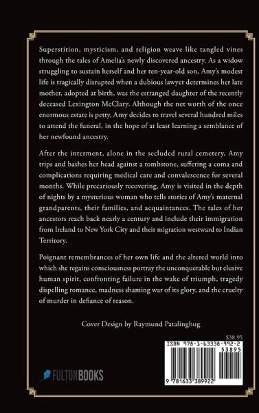 Superstition, mysticism, and religion weave like tangled vines through the tales of Amelia's newly discovered ancestry. As a widow struggling to sustain herself and her ten-year-old son, Amy's modest life is tragically disrupted when a dubious lawyer determines her late mother, adopted at birth, was the estranged daughter of the recently deceased Lexington McClary. Although the net worth of the once enormous estate is petty, Amy decides to travel several hundred miles to attend the funeral, in the hope of at least learning a semblance of her newfound ancestry. After the interment, alone in the secluded rural cemetery, Amy trips and bashes her head against a tombstone, suffering a coma and complications requiring medical care and convalescence for several months. While precariously recovering, Amy is visited in the depth of nights by a mysterious woman who tells stories of Amy's maternal grandparents, their families, and acquaintances. The tales of her ancestors reach back nearly a century and include their immigration from Ireland to New York City and their migration westward to Indian Territory. Poignant remembrances of her own life and the altered world into which she regains consciousness portray the unconquerable but elusive human spirit, confronting failure in the wake of triumph, tragedy dispelling romance, madness shaming war of its glory, and the cruelty of murder in defiance of reason.