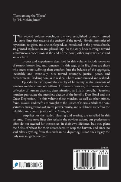 "Tares among the Wheat" By "H. Melvin James" This second volume concludes the two established primary framed story-lines that traverse the entirety of the novel. Herein, mysteries of mysticism, religion, and ancient legend, as introduced in the previous book, are granted explanation and plausibility. As the story lines converge toward simultaneous conclusion at the end of the novel, other mysteries arise and are resolved. Events and experiences described in this volume include extremes of sorrow, horror, joy, and romance. In this saga, as in life, there are those who meet more suffering than comfort, but the balance of the aggregate, inevitably and eventually, tilts toward triumph, justice, peace, and contentment. Redemption, as in reality, is both compromised and realized. Episodes herein expose the cruelty of humanity as the torments of warriors and the crimes of civilians. Ultimately however, the unconquerable collective of human decency, determination, and faith prevails. Senseless murders punctuate the merciless decade of the horrific Dust Bowl and the Great Depression. In this volume those murders, as well as other crimes, fraud, assault, and theft, are brought to the justice of mortals, while the non-statutory transgressions of greed, power, vanity, and selfishness are left to the infallible and certain justice of the Almighty. Surprises for the reader, pleasing and teasing, are unveiled in this volume. These story lines also reclaim the obvious axiom, our predecessors often do not succeed for themselves, in their own lifetimes, but they plant the fields of wheat for their descendants to reap the harvest, and since no soul takes anything from this earth in his departing, is not one's legacy the only true tangible success?
