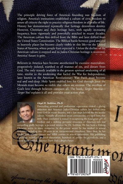 The principle driving force of America's founding was freedom of religion. America's institutions established a culture of civic freedom to assure all citizens the right to practice religious freedom in all walks of life. History has demonstrated repeatedly that heritage determines destiny. However, Christians and their heritage have, with rapidly increasing frequency, been vigorously and powerfully attacked in recent decades. The American culture first drifted from the Bible and later drifted from the United States Constitution. The Biblical battle between good and evil in heavenly places has become clearly visible in this life--in the United States of America, where people least expected it. Unless the decline of the American culture is stopped and its Judeo-Christian heritage is recovered, America' future is grim.Believers in America have become anesthetized by excessive materialism, progressively isolated, numbed to all manner of sin, and distant from God. The only remedy available is the greatest spiritual awakening of all time, similar to the awakening that fueled the War for Independence, later known as the American Revolutionary War. Faith must become real and soul-deep. Holy Spirit enabled love for God through Jesus the Messiah must become so visible that others are envious. The overflow of God's love through believers conquers all. The book, Target America--Target You! explains it all and provides your action plan. Lloyd H. Stebbins, Ph.D.Dovetailing personal and professional experiences evoked a glaring awareness that America's Judeo-Christian culture has drifted away from God in recent decades, just a few steps behind the the secular culture. Virtually all modern social controversies emerged from that drift. Their resolution is rooted in recapturing the God-given gift of freedom and a striking, pervasive awareness of America's rich and compelling godly heritage, a personal mission for Dr. Stebbins. He has been a lifelong Christian active in many ministries. In the private sector, he has worked in several industries including over 20 years as an environmental consultant. Since then, he has taught both science courses and MBA courses in several universities. His publishing experience includes a doctoral dissertation, hundreds of articles for periodicals, and a recent book entitled, America: Dark Slide--Bright Future.