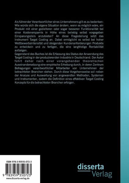 Gegenstand des Buches ist die Erfassung des Status der Anwendung des Target Costing in der produzierenden Industrie in Deutschland. Der Autor führt daher nach einer vorangehenden theoretischen Auseinandersetzung eine empirische Erhebung durch, in deren Zentrum Befragungen verantwortlicher Mitarbeiter von Unternehmen der betrachteten Branchen stehen. Durch diese Vorgehensweise soll neben der Analyse und Auswertung von angewandten Methoden, Systemen und Instrumenten, zudem die Definition eines effektiven Target Costing Konzepts für die betrachteten Branchen erfolgen.