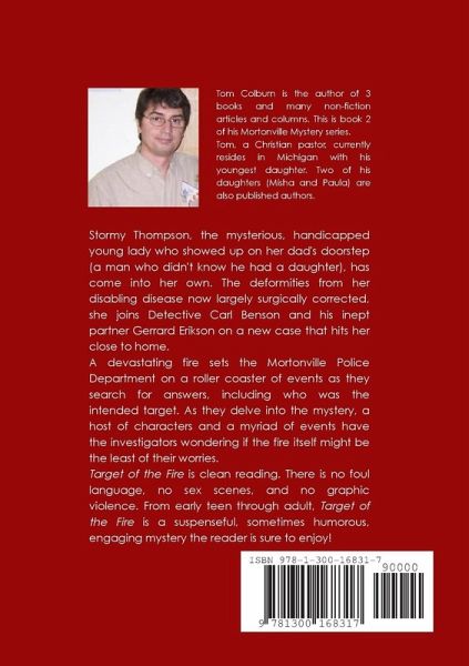 Stormy Thompson, the mysterious, handicapped young lady who showed up on her dad's doorstep (a man who didn't know he had a daughter), has come into her own. The deformities from her disabling disease now largely surgically corrected, she joins Detective Carl Benson and his inept partner Gerrard Erikson on a new case that hits her close to home. A devastating fire sets the Mortonville Police Department on a roller coaster of events as they search for answers, including who was the intended target. As they delve into the mystery, a host of characters and a myriad of events have the investigators wondering if the fire itself might be the least of their worries. Target of the Fire is clean reading. There is no foul language, no sex scenes, and no graphic violence. From early teen through adult, Target of the Fire is a suspenseful, sometimes humorous, engaging mystery the reader is sure to enjoy!