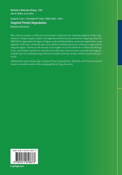 This volume contains a collection of innovative techniques for studying targeted protein degradation. Chapters guide readers through heterobifunctional proteolysis-targeting chimeras (PROTACs) approaches, E3 ligase, E3 ligase-induced ubiquitylation, proteomic approaches, novel degrader molecules, molecular glue, and stabilize binding interaction between a target and E3 ubiquitin ligase. Written in the format of the highly successful Methods in Molecular Biology series, each chapter includes an introduction to the topic, lists necessary materials and reagents, includes tips on troubleshooting and known pitfalls, and step-by-step, readily reproducible protocols.