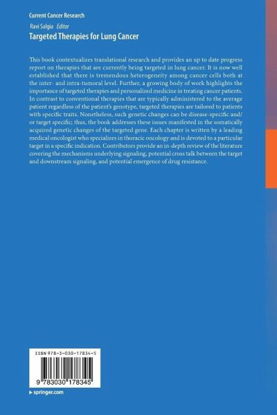 This book contextualizes translational research and provides an up to date progress report on therapies that are currently being targeted in lung cancer. It is now well established that there is tremendous heterogeneity among cancer cells both at the inter- and intra-tumoral level. Further, a growing body of work highlights the importance of targeted therapies and personalized medicine in treating cancer patients. In contrast to conventional therapies that are typically administered to the average patient regardless of the patient's genotype, targeted therapies are tailored to patients with specific traits. Nonetheless, such genetic changes can be disease-specific and/or target specific; thus, the book addresses these issues manifested in the somatically acquired genetic changes of the targeted gene. Each chapter is written by a leading medical oncologist who specializes in thoracic oncology and is devoted to a particular target in a specific indication. Contributors provide an in-depth review of the literature covering the mechanisms underlying signaling, potential cross talk between the target and downstream signaling, and potential emergence of drug resistance.