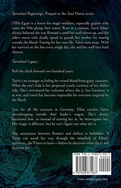 Tarnished Beginnings, Prequel to the Soul Dance series: 1700s Egypt is a haven for magic-wielders, especially gypsies who roam the Nile plying their wares. Born in a caravan, Tairin Jabari always believed she was Romani-until her wolf shows up, and the elders move with deadly speed to punish her mother for mating outside the blood. Fearing for her own life, Tairin runs away. With her survival on the line every single day, she and her wolf face hard choices. Tarnished Legacy: Roll the clock forward two hundred years. Tairin's no stranger to hiding her mixed blood from gypsy caravans. What she can't hide is her perpetual youth, courtesy of her shifter side. She's overstayed her welcome where she is, but Germany is at war, and travel has become impossible for everyone targeted by the Reich. Seer for all the caravans in Germany, Elliot catches Tairin eavesdropping outside their leader's wagon. She's always fascinated him, so instead of turning her in, he interrogates her. Her magic is different, but he can't figure out what she is. Any association between Romani and shifters is forbidden. If Tairin can wend her way through the minefield of Elliot's questions, she'll have to leave-before he discovers what she is and destroys her.