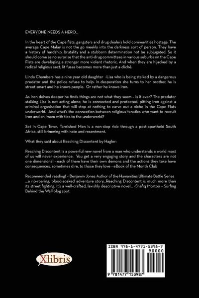 EVERYONE NEEDS A HERO¿ In the heart of the Cape flats, gangsters and drug dealers hold communities hostage. The average Cape Malay is not the go meekly into the darkness sort of person. They have a history of hardship, brutality and a stubborn determination not be subjugated. So it should come as no surprise that the anti-drug committees in various suburbs on the Cape Flats are developing a stronger more violent rhetoric. And when they are hijacked by a radical religious sect, lit fuses becomes more than just a cliché. Linda Chambers has a nine year old daughter -Lisa who is being stalked by a dangerous predator and the police refuse to help. In desperation she turns to her brother, he is street smart and he knows people. Or rather he knows Iron. As Iron delves deeper he finds things are not what they seem ¿ is it ever? The predator stalking Lisa is not acting alone; he is connected and protected, pitting Iron against a criminal organisation that will stop at nothing to carve out a niche in the Cape Flats underworld. And what¿s the connection between religious fanatics who want to recruit Iron and an Imam with ties to the underworld? Set in Cape Town, Tarnished Men is a non-stop ride through a post-apartheid South Africa, still brimming with hate and resentment. What they said about Reaching Discontent by Hagler: Reaching Discontent is a powerful new novel from a man who understands a world most of us will never experience. You get a very engaging story and the characters are not one dimensional - each of them have their own demons and the actions they take have consequences, sometimes dire, to those they love - eBook of the Month Club Recommended reading! ¿ Benjamin Jones Author of the Humanities Ultimate Battle Series¿a rip-roaring, blood-soaked adventure story¿Reaching Discontent is much more than its street fighting. It¿s a well-crafted, lavishly descriptive novel¿ -Shafiq Morton ¿ Surfing Behind the Wall blog spot.