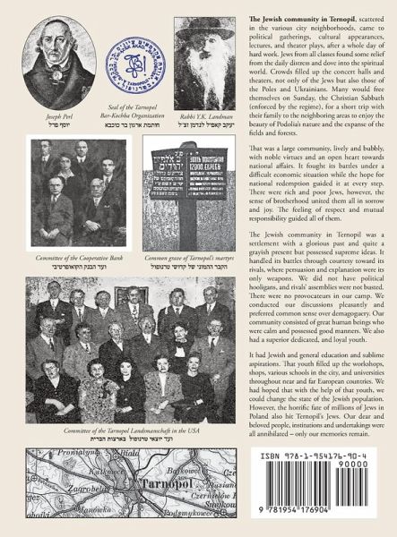Tarnopol is a city in western Ukraine roughly 80 miles east of Lviv. During its history, it changed hands several times. It was annexed to Austria in 1772 as part of Galicia and remained under Austrian rule until 1918 when the empire collapsed. During World War I the city passed from German and Austrian forces to Russia several times. For a brief time at the end of 1918, it was part of the Western Ukrainian Republic and afterwards came under the flag of the newly reconstituted Poland. Poland ceased to exist after the Nazi Germany invaded the country in 1939 and, as with so many other Jewish communities there, Tarnopol was absorbed into the Soviet Union as part of Ukraine. Following the Soviet Union's fall emerged as part of an independent Ukraine. The turmoil of World War I and the changes it wrought in are well-documented in this Yizkor book with chapters chronicling the Russian conquest of 1914-1915, the disintegration of Austria and the days of Ukrainian rule. The book features an extensive history of Tarnopol written specifically for it by the well-known Jewish historian N.M. Gelber that drew on previously unpublished archival material shedding new light on Ternopil's history, particularly the Enlightenment period. A central part of the book are the several chapters devoted to the rise of the Zionist movement and its politics, personalities and competing philosophies. All of this came to an end with the eruption of World War II. The Germans occupied the city in 1941. A section of the book titled "The Ternopil Ghetto and its Destruction" recounts the aftermath. First there were pogroms that claimed about 5,000 lives. Later, a ghetto was established into which 12,500 people were crammed. Some were murdered there, and others were sent to the Belżec camp in 1942. Out of the eighteen thousand Jews residing in Ternopil when the Germans arrived, only 139 survived.