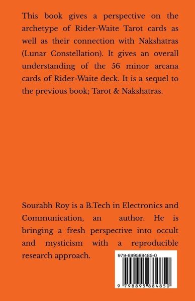 This book gives a perspective on the archetype of Rider-Waite Tarot cards as well as their connection with Nakshatras (Lunar Constellation). It gives an overall understanding of the 56 minor arcana cards of Rider-Waite deck. It is a sequel to previous book Tarot and Nakshatras.