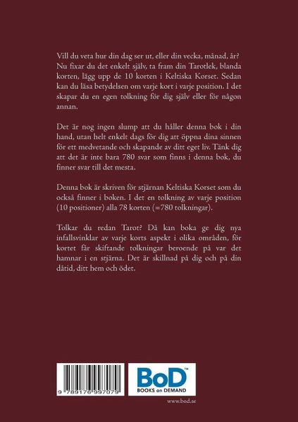 Denna bok är skriven för stjärnan Keltiska Korset som du också finner i boken. I det en tolkning av varje position (10 positioner) alla 78 korten (=780 tolkningar).