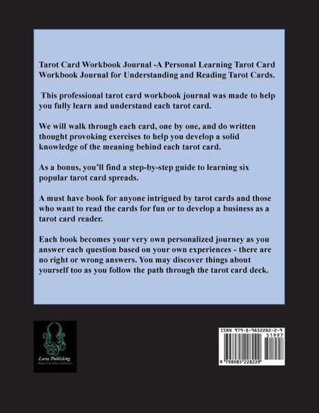 Tarot Card Workbook Journal - A Personal Learning Tarot Card Workbook Journal for Understanding and Reading Tarot Cards. Second Edition This professionally printed and bound tarot card workbook journal was developed to help you fully learn and understand each tarot card. We will walk through each card, one by one, and do written exercises to help you develop a solid knowledge of the meaning behind each tarot card. As an additional bonus, readers will find a step by step guide is included for learning six popular tarot card spreads. A must have book for anyone intrigued by tarot cards and those who want to read the cards for fun or to develop a business as a tarot card reader. The Tarot Card Workbook Journal is a generous 8 1/2 x 11 in size. Professionally bound makes it extra sturdy - it is built to last as you study and learn each card and also to have as a reference later. Each book becomes your very own personalized journey as you answer each question based on your own experiences - there are no right or wrong answers. You may discover things about yourself too as you follow the path through the tarot card deck. Beautiful and thoughtful gift. The Rider Waite tarot card set is used for reference in this workbook.
