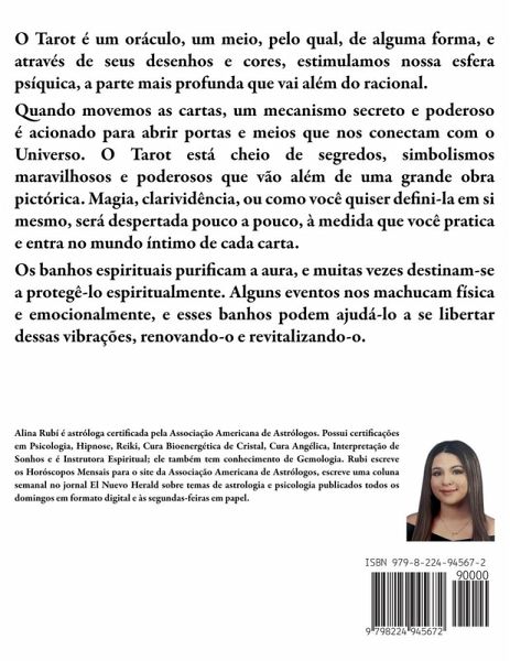 O Tarot é um oráculo, um meio, pelo qual, de alguma forma, e através de seus desenhos e cores, estimulamos nossa esfera psíquica, a parte mais profunda que vai além do racional. Quando movemos as cartas, um mecanismo secreto e poderoso é acionado para abrir portas e meios que nos conectam com o Universo. O Tarot está cheio de segredos, simbolismos maravilhosos e poderosos que vão além de uma grande obra pictórica. Magia, clarividência, ou como você quiser defini-la em si mesmo, será despertada pouco a pouco, à medida que você pratica e entra no mundo íntimo de cada carta. Os banhos espirituais purificam a aura, e muitas vezes destinam-se a protegê-lo espiritualmente. Alguns eventos nos machucam física e emocionalmente, e esses banhos podem ajudá-lo a se libertar dessas vibrações, renovando-o e revitalizando-o.