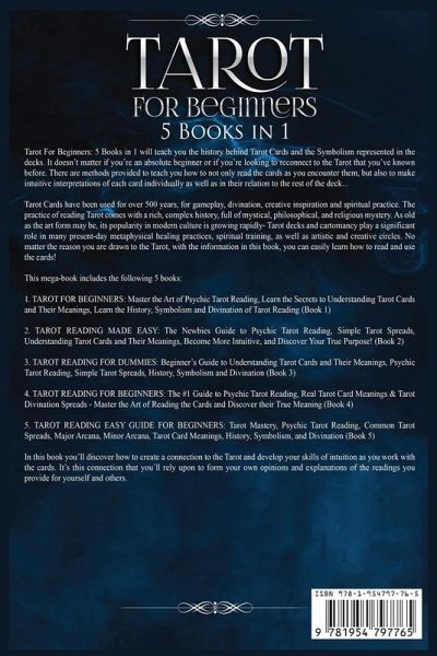 Tarot For Beginners will teach you the history behind Tarot Cards and the Symbolism represented in the decks. It doesn't matter if you're an absolute beginner or if you're looking to reconnect to the Tarot that you've known before. There are methods provided to teach you how to not only read the cards as you encounter them, but also how to make intuitive interpretations of each card individually as well as in their relation to the rest of the deck... Tarot Cards have been used for over 500 years for gameplay, divination, creative inspiration and spiritual practice. The practice of reading Tarot comes with a rich, complex history, full of mystical, philosophical, and religious mystery. As old as the art form may be, its popularity in modern culture is growing rapidly- Tarot decks and cartomancy play a significant role in many present-day metaphysical healing practices, spiritual training, as well as artistic and creative circles. No matter the reason you are drawn to the Tarot, with the information in this book, you can easily learn how to read and use the cards! This five-in-one series includes the following 5 books: 1. TAROT FOR BEGINNERS: Master the Art of Psychic Tarot Reading, Learn the Secrets to Understanding Tarot Cards and Their Meanings, Learn the History, Symbolism and Divination of Tarot Reading (Book 1) 2. TAROT READING MADE EASY: The Newbies Guide to Psychic Tarot Reading, Simple Tarot Spreads, Understanding Tarot Cards and Their Meanings, Become More Intuitive, and Discover Your True Purpose! (Book 2) 3. TAROT READING FOR DUMMIES: Beginner's Guide to Understanding Tarot Cards and Their Meanings, Psychic Tarot Reading, Simple Tarot Spreads, History, Symbolism and Divination (Book 3) 4. TAROT READING FOR BEGINNERS: The #1 Guide to Psychic Tarot Reading, Real Tarot Card Meanings & Tarot Divination Spreads - Master the Art of Reading the Cards and Discover their True Meaning (Book 4) 5. TAROT READING EASY GUIDE FOR BEGINNERS: Tarot Mastery, Psychic Tarot Reading, Common Tarot Spreads, Major Arcana, Minor Arcana, Tarot Card Meanings, History, Symbolism, and Divination (Book 5) In this book you will discover how to create a connection to the Tarot and develop your skills of intuition as you work with the cards. It's this connection that you'll rely upon to form your own opinions and explanations of the readings you provide for yourself and others... Grab your copy of Tarot For Beginners now!