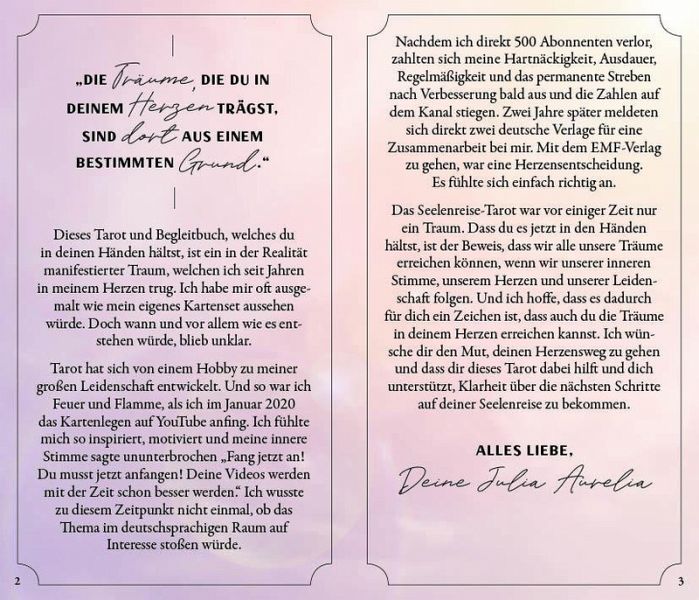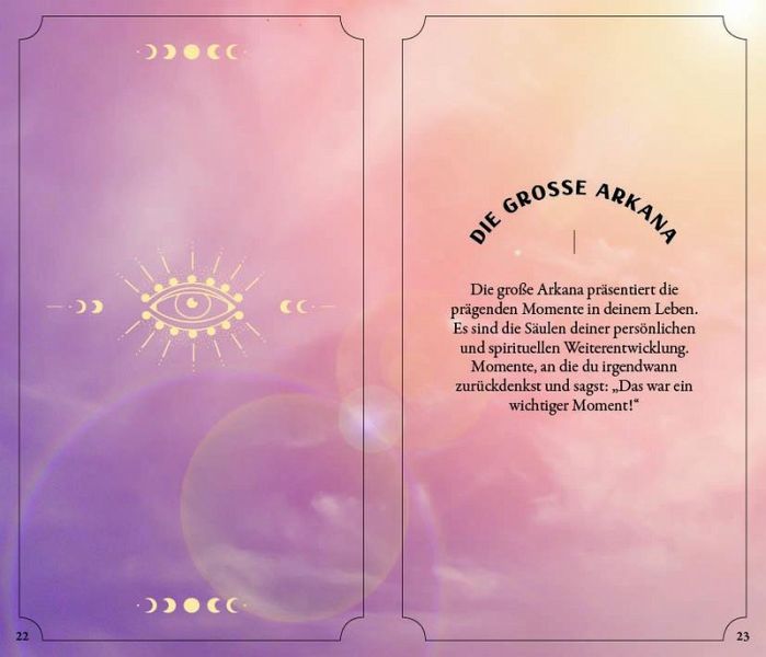 Das Kartendeck beinhaltet alle 78 traditionellen Tarot-Motive, die großen und kleinen Arkana, und besticht durch seine wunderschöne und außergewöhnliche Gestaltung. Sowohl das Legen der Karten als auch die anschließende Deutung werden im beiligenden Handbuch verständlich erklärt. Tauche jetzt ganz bewusst ein in deine Seelenreise und werde zur Meisterin deines Schicksals: Erforsche die Energien und Kräfte, die dich auf deiner Seelenreise durchs Leben begleiten und werde empfänglich für die Botschaften deiner Seele.
