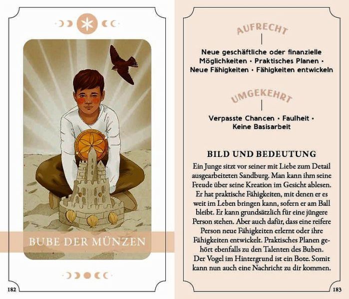 Kunstvoll illustrierte Tarotkarten mit Goldrand, die den Blick in die Zukunft offenbaren und die Gegenwart verzaubernEin begleitendes Handbuch, das die Legemuster erklärt und über die Deutung der Karten informiertHochwertige Box mit edler Folienprägung auf dem Cover