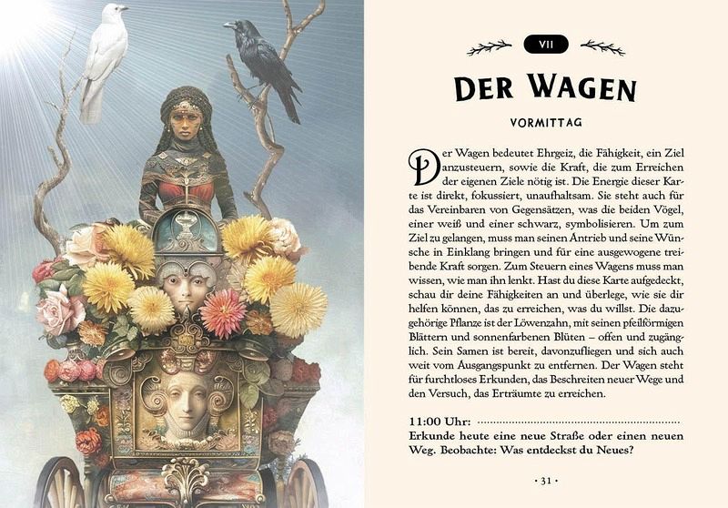 Jede Karte der Großen Arkana ist einer Pflanze und einer bestimmten Stunde des Tages zugeordnet - die Kleine Arkana nimmt dich mit durch die vier großen Zeitabschnitte: Morgen, Mittag, Abend und Nacht. So entsteht eine tief verwurzelte Verbindung zwischen Tarot, Natur und dem eigenen inneren Rhythmus.
