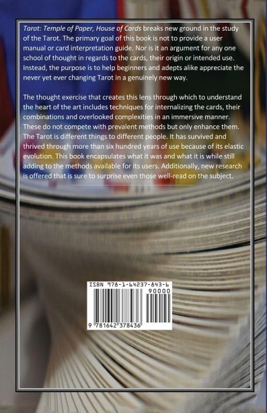Tarot: Temple of Paper, House of Cards breaks new ground in the study of the Tarot. The primary goal of this book is not to provide a user manual or card interpretation guide. Nor is it an argument for any one school of thought in regards to the cards, their origin or intended use. Instead, the purpose is to help beginners and adepts alike appreciate the never yet ever changing Tarot in a genuinely new way. The thought exercise that creates this lens through which to understand the heart of the art includes techniques for internalizing the cards, their combinations and overlooked complexities in an immersive manner. These do not compete with prevalent methods but only enhance them. The Tarot is different things to different people. It has survived, and thrived through more than six hundred years of use because of its elastic evolution. This book encapsulates what it was and what it is while still adding to the methods available for its users. Additionally, new research is offered that is sure to surprise even those already well-read on the subject. And speaking of that subject, the practice of Tarot is fascinating on multiple levels including the historic, artistic, folkloric, psychological and spiritual. All of those and more are touched on in a work meant to revitalize not the Tarot itself, but the ways in which we can better understand and make use of it.