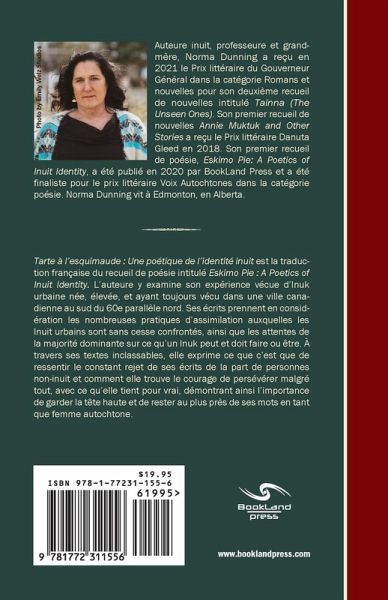 Tarte à l'esquimaude: une poétique de l'identité inuit is the French translation of Eskimo Pie: A Poetics of Inuit Identity previously published in English by BookLand Press. This poetry collection examines the author's lived history as an Inuk who was born, raised and continues to live south of sixty. Her writing takes into account the many assimilative practices that Inuit continue to face and the expectations of mainstream as to what an Inuk person can and should be. Her words examine what it is like to feel the constant rejection of her work from non-Inuit people and how she must in some way find the spirit to carry through with what she holds to be true demonstrating the importance of standing tall and close to her words as an Indigenous woman.