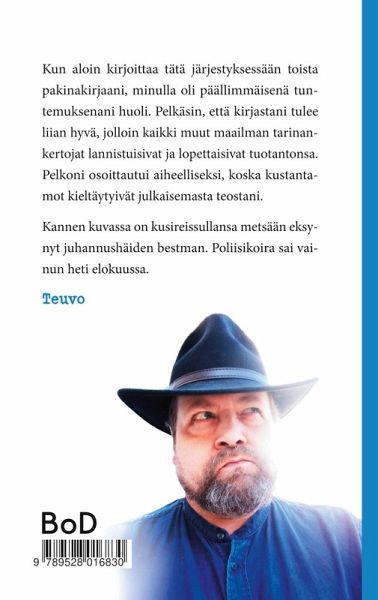 Se on se yksi kirja, jossa se perhe menee sinne johonkin vuoristohotelliin kotimiehiksi talveksi? Ja sillä pikkupojalla on se sellainen kyky ottaa muihin telepaattinen yhteys, niin kuin ¿hohtö. Ja se isä tulee hulluksi. Tämä minun kirjani saattaa olla jopa sitä romaania parempi. Kyseessä on kuitenkin siis pakinakokoelma eikä romaani, kuten se kummitushotellikirja (oliko se Waltarin?) Toivon, että teokseni rivien välistä, ja ennen kaikkea varsinaisista riveistä, heijastuu rakkauteni ja syvä mielenkiintoni mm. maailmankirjallisuutta kohtaan. Nyt mennään sarkasmin, itseironian ja tajunnanvirran viitoittamalla tiellä. Tervetuloa!