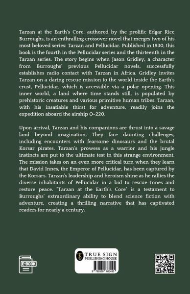 ""Tarzan at the Earth's Core"" is an adventurous novel penned by Edgar Rice Burroughs, renowned for its captivating narrative and imaginative depiction of the legendary hero Tarzan. In this unique installment of the Tarzan series, the story follows Tarzan as he embarks on an extraordinary journey to the inner world of Pellucidar, a land located at the Earth's core. Accompanied by a group of intrepid explorers, Tarzan encounters prehistoric creatures, ancient civilizations, and fantastical landscapes as they navigate through the uncharted depths of the Earth. With his unparalleled strength, survival skills, and courage, Tarzan proves to be an invaluable ally as they face numerous challenges and adversaries along the way. ""Tarzan at the Earth's Core"" is a thrilling tale of adventure and discovery that transports readers to a world of wonder and danger, where the boundaries of reality are pushed to their limits. Burroughs' vivid imagination and dynamic characters make this novel a captivating and unforgettable journey into the heart of the Earth.