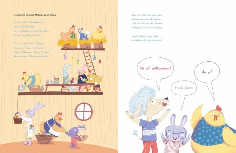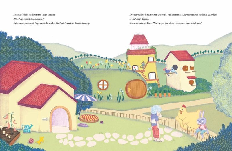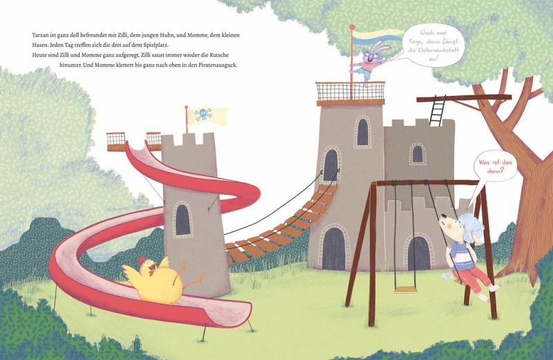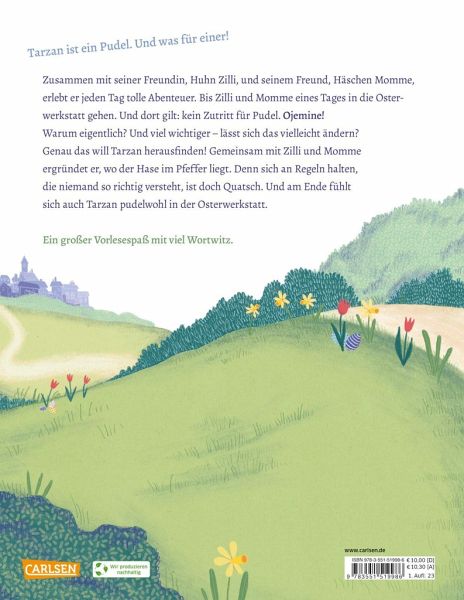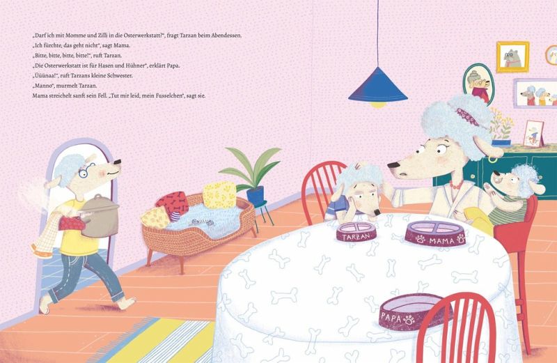Dann hat er eine zündende Idee: All die Eier anzumalen, ist doch eine Hundearbeit. Also genau das Richtige für einen Pudel. Und weil alle anderen finden, dass es hundsgemein sei, sich an Regeln zu halten, die keiner versteht - und zwar nur, weil man gewisse Dinge schon immer so gemacht hat -, darf Tarzan von nun an auch in die Osterwerkstatt gehen.