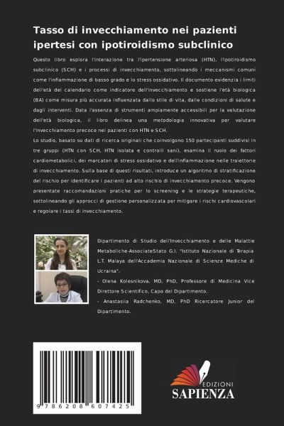 Questo libro esplora l'interazione tra l'ipertensione arteriosa (HTN), l'ipotiroidismo subclinico (SCH) e i processi di invecchiamento, sottolineando i meccanismi comuni come l'infiammazione di basso grado e lo stress ossidativo. Il documento evidenzia i limiti dell'età del calendario come indicatore dell'invecchiamento e sostiene l'età biologica (BA) come misura più accurata influenzata dallo stile di vita, dalle condizioni di salute e dagli interventi. Data l'assenza di strumenti ampiamente accessibili per la valutazione dell'età biologica, il libro delinea una metodologia innovativa per valutare l'invecchiamento precoce nei pazienti con HTN e SCH.Lo studio, basato su dati di ricerca originali che coinvolgono 150 partecipanti suddivisi in tre gruppi (HTN con SCH, HTN isolata e controlli sani), esamina il ruolo dei fattori cardiometabolici, dei marcatori di stress ossidativo e dell'infiammazione nelle traiettorie di invecchiamento. Sulla base di questi risultati, introduce un algoritmo di stratificazione del rischio per identificare i pazienti ad alto rischio di invecchiamento precoce. Vengono presentate raccomandazioni pratiche per lo screening e le strategie terapeutiche, sottolineando gli approcci di gestione personalizzata per mitigare i rischi cardiovascolari e regolare i tassi di invecchiamento.
