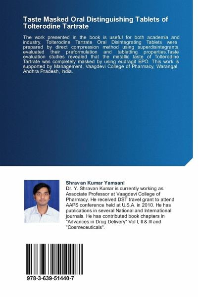 The work presented in the book is useful for both academia and industry. Tolterodine Tartrate Oral Disintegrating Tablets were prepared by direct compression method using superdisintegrants, evaluated their preformulation and tabletting properties.Taste evaluation studies revealed that the metallic taste of Tolterodine Tartrate was completely masked by using eudragit EPO. This work is supported by Management, Vaagdevi College of Pharmacy, Warangal, Andhra Pradesh, India.