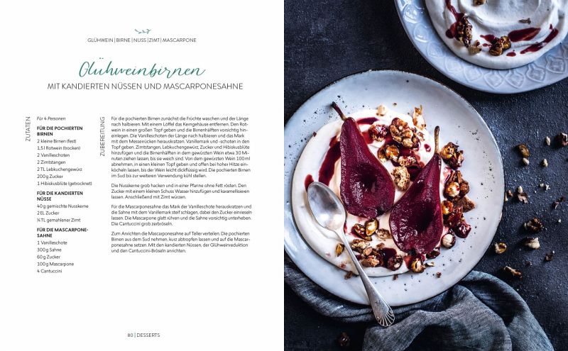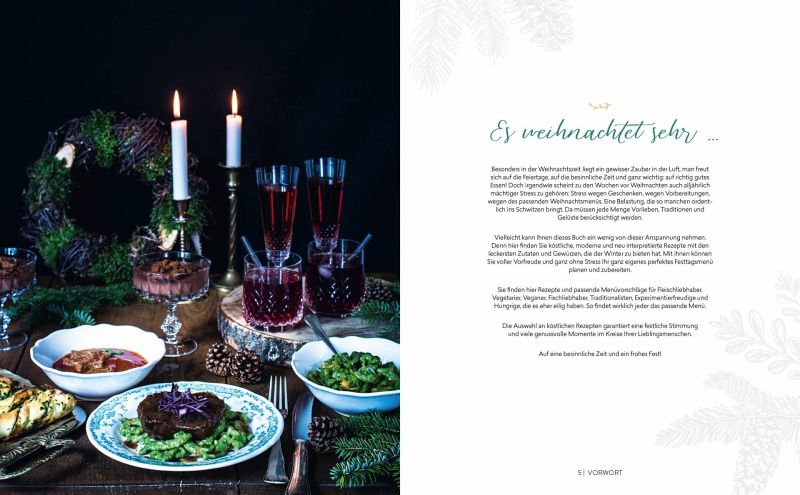 Leckere weihnachtliche Menüs. Ein Fest für die Sinne. Über 50 kreative, raffinierte und überraschende Rezepte für Advent, Weihnachten und Neujahr. Mit abgestimmten Menüvorschlägen, perfekter Getränkebegleitung, Tipps zur cleveren Vorbereitung sowie zum Austauschen und kombinieren einzelner Gänge. Für jeden ist etwas dabei, Weihnachtsgans im Asia-Style, Gefüllter Kürbis mit Quinoa, Nüssen und Mandelcreme, Grüner Salat mit Walnüssen, Beeren, Feta und Cranberry-Dressing, Pfirsich-Parfait mit Chrunchy Granola, Popcorn und Beeren.