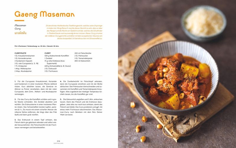 Dieses Buch ist eine kleine Anleitung, sich an die Thailändische Küche zu wagen. Da der Autor ein Europäer ist, hat man sofort das Gefühl, dass man das auch schaffen kann. Da das Buch mit einem ausführlichen Theorieteil beginnt, hat man gleich das nötige Rüstzeug in der Hand, um sich die erforderliche Ausrüstung von Gerätschaften bis zu Gewürzen alles anzuschaffen. Dazu gibt es viele Infos rund um thailändische Städte und Regionen, Traditionen und Lebensart in Wort und Bild.