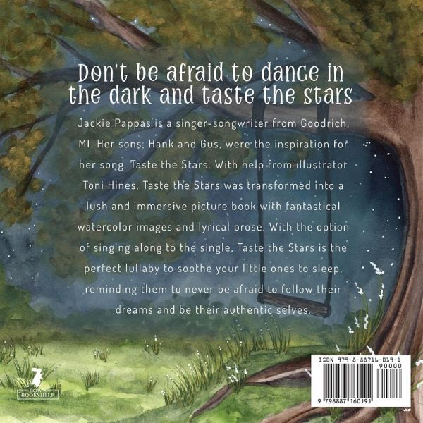 Don't be afraid to dance in the dark and taste the stars. Jackie Pappas is a singer-songwriter from Goodrich, MI. Her sons, Hank and Gus, were the inspiration for her song, Taste the Stars. With help from illustrator Toni Hines, Taste the Stars was transformed into a lush and immersive picture book with fantastical watercolor images and lyrical prose. With the option of singing along to the single, Taste the Stars is the perfect lullaby to soothe your little ones to sleep, reminding them to never be afraid to follow their dreams and be their authentic selves.