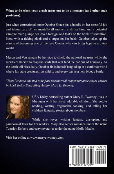 What to do when your crush turns out to be a monster (and other such problems). Just when correctional nurse October Grace has a handle on her stressful job and taking care of her mentally ill mother, a shifter king and a potential vampire mate plunge her into a foreign land that's on the brink of starvation. Now, with a ticking clock and a target on her back, October takes up the mantle of becoming one of the rare Omens who can bring hope to a dying world. Mason and Von remain by her side to shield the national treasure while she sacrifices herself to reap the souls that will feed the nations of Terraway. As the death toll rises daily, October finds herself tangled up in a cutthroat world where fairytale creatures run wild... and every day is a new bloody battle. If you love Bella Forrest, Cassandra Clare, and falling in love with the bad boy, you'll devour the "Terraway" series by Mary E. Twomey. "Taste" is book one in a 9-part reaper romance series written by USA Today Bestselling Author Mary E. Twomey.