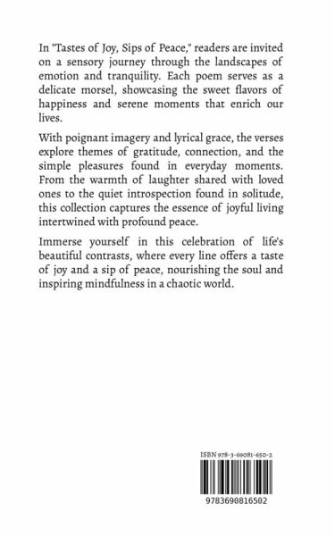 In "Tastes of Joy, Sips of Peace," readers are invited on a sensory journey through the landscapes of emotion and tranquility. Each poem serves as a delicate morsel, showcasing the sweet flavors of happiness and serene moments that enrich our lives. With poignant imagery and lyrical grace, the verses explore themes of gratitude, connection, and the simple pleasures found in everyday moments. From the warmth of laughter shared with loved ones to the quiet introspection found in solitude, this collection captures the essence of joyful living intertwined with profound peace. Immerse yourself in this celebration of life's beautiful contrasts, where every line offers a taste of joy and a sip of peace, nourishing the soul and inspiring mindfulness in a chaotic world.