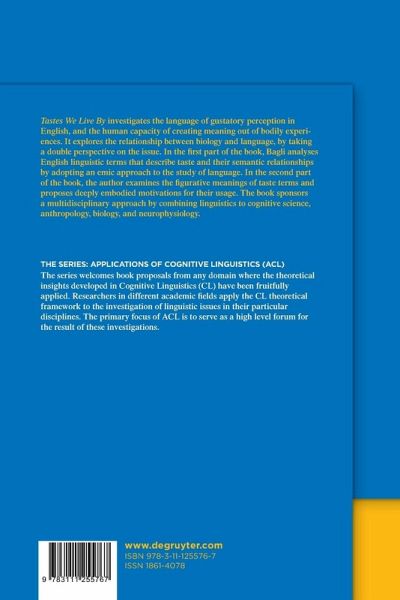 In the first part of the book, the author explores the semantic dimensions of Taste terms with a usage-based approach. With the application of experimental protocols, Bagli enquires their possible organization in a radial network and calculates the Salience index of gustatory terms in both American and British English. The second part of the book is an overview of the metaphorical extensions that motivate the polysemy of Taste terms, with the aid of corpus analysis methods and various texts.