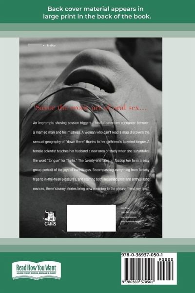 Savor the erotic art of oral sex...An impromptu shaving session triggers a lustful bathroom encounter between a married man and his mistress. A woman who can't read a map discovers the sensual geography of ''down there'' thanks to her girlfriend's talented tongue. A female scientist teaches her husband a new area of study when she substitutes the word ''tongue'' for ''hello.'' The twenty-one tales in Tasting Her form a sexy group portrait of the joys of cunnilingus. Encompassing everything from fantasy trips to in-the-flesh pleasures, and starring both seasoned pros and enthusiastic novices, these steamy stories bring new meaning to the phrase ''read my lips.''