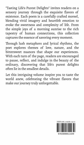 "Tasting Life's Purest Delights" invites readers on a sensory journey through the exquisite flavors of existence. Each poem is a carefully crafted morsel, blending vivid imagery and heartfelt emotion to evoke the sweetness and complexity of life. From the simple joys of a morning sunrise to the rich tapestry of human connections, this collection captures the essence of savoring every moment. Through lush metaphors and lyrical rhythms, the poet explores themes of love, nature, and the bittersweet nuances that shape our experiences. With each turn of the page, readers are encouraged to pause, reflect, and indulge in the beauty of the ordinary, discovering that life's purest delights often lie in the smallest details. Let this intriguing volume inspire you to taste the world anew, celebrating the vibrant flavors that make our journey truly unforgettable.