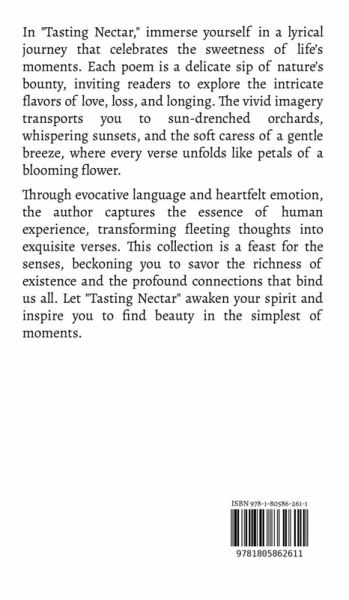 In "Tasting Nectar," immerse yourself in a lyrical journey that celebrates the sweetness of life's moments. Each poem is a delicate sip of nature's bounty, inviting readers to explore the intricate flavors of love, loss, and longing. The vivid imagery transports you to sun-drenched orchards, whispering sunsets, and the soft caress of a gentle breeze, where every verse unfolds like petals of a blooming flower. Through evocative language and heartfelt emotion, the author captures the essence of human experience, transforming fleeting thoughts into exquisite verses. This collection is a feast for the senses, beckoning you to savor the richness of existence and the profound connections that bind us all. Let "Tasting Nectar" awaken your spirit and inspire you to find beauty in the simplest of moments.