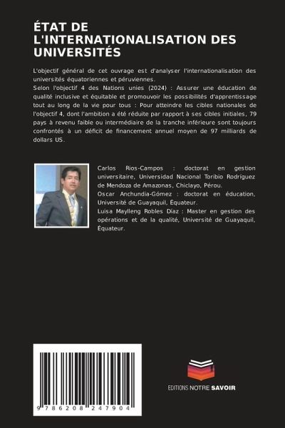 L'objectif général de cet ouvrage est d'analyser l'internationalisation des universités équatoriennes et péruviennes.Selon l'objectif 4 des Nations unies (2024) : Assurer une éducation de qualité inclusive et équitable et promouvoir les possibilités d'apprentissage tout au long de la vie pour tous : Pour atteindre les cibles nationales de l'objectif 4, dont l'ambition a été réduite par rapport à ses cibles initiales, 79 pays à revenu faible ou intermédiaire de la tranche inférieure sont toujours confrontés à un déficit de financement annuel moyen de 97 milliards de dollars US.