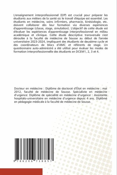 L'enseignement interprofessionnel (EIP) est crucial pour préparer les étudiants aux métiers de la santé où le travail d'équipe est essentiel. Les étudiants en médecine, soins infirmiers, pharmacie, kinésiologie, etc. doivent collaborer dès leur formation via diverses expériences d'apprentissage (classe, stage, simulation). L'objectif de cette étude est d'évaluer les expériences d'apprentissage interprofessionnel en milieu académique et clinique. Cette étude descriptive transversale s'est déroulée à la faculté de médecine de Sousse au début de l'année universitaire 2023-2024, impliquant des étudiants de deuxième cycle et des coordinateurs de blocs d'AMC et référents de stage. Un questionnaire auto-administré a été utilisé pour évaluer les modes de formation interprofessionnelle des étudiants en DCEM1, 2, 3 et 4.