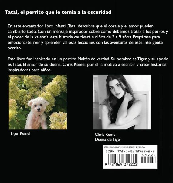 Tatai, el perrito que le temía a la oscuridad En este encantador libro infantil, Tatai descubre que el coraje y el amor pueden cambiarlo todo. Con un mensaje inspirador sobre cómo debemos tratar a los perros y el poder de la valentía, esta historia cautivará a niños de 3 a 9 años. Prepárate para emocionarte, reír y aprender valiosas lecciones con las aventuras de este inteligente perrito. (In this charming children's book, Tatai discovers that courage and love can change everything. With an inspiring message about how we should treat dogs and the power of bravery, this story will captivate children aged 3 to 9. Get ready to be enchanted, giggle with joy, and learn valuable lessons from the adventures of this clever little dog.) Este libro fue inspirado en un perrito Maltés de verdad. Su nombre es Tiger, y su apodo es Tatai. El amor de su dueña, Chris Kemel, por él la motivó a escribir y crear historias inspiradoras para niños. (This book was inspired by a real Maltese dog. His name is Tiger, and his nickname is Tatai. The love his owner, Chris Kemel, has for him motivated her to write and create inspiring stories for children.)