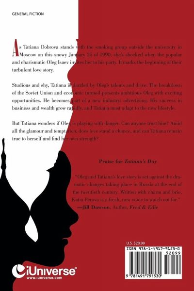 As Tatiana Dobrova stands with the smoking group outside the university in Moscow on this snowy January 25 of 1990, she's shocked when the popular and charismatic Oleg Isaev invites her to his party. It marks the beginning of their turbulent love story. Studious and shy, Tatiana is dazzled by Oleg's talents and drive. The breakdown of the Soviet Union and economic turmoil presents ambitious Oleg with exciting opportunities. He becomes part of a new industry: advertising. His success in business and wealth grow rapidly, and Tatiana must adapt to the new lifestyle. But Tatiana wonders if Oleg is playing with danger. Can anyone trust him? Amid all the glamour and temptation, does love stand a chance, and can Tatiana remain true to herself and find her own strength? Praise for Tatiana's Day "Oleg and Tatiana's love story is set against the dramatic changes taking place in Russia at the end of the twentieth century. Written with charm and brio, Katia Perova is a fresh, new voice to watch out for." -Jill Dawson, Author, Fred & Edie