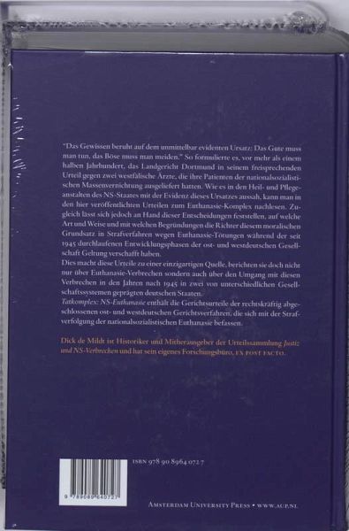Tatkomplex: NS-Euthanasie is een bronnenpublicatie over daders en medeplichtigen van het nationaal-socialistische vernietigingsprogramma gericht tegen lichamelijk en geestelijk gehandicapten. Het bevat alle naoorlogse Oost- en West-Duitse strafvonnissen over dit allereerste uitroeiingsprogramma van het 'Derde Rijk'. Voor het eerst zijn deze vonniss