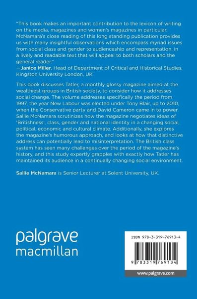 This book discusses Tatler, a monthly glossy magazine aimed at the wealthiest groups in British society, to consider how it addresses social change. The volume addresses specifically the period from 1997, the year New Labour was elected under Tony Blair, up to 2010, when the Conservative party and David Cameron came in to power. Sallie McNamara scrutinizes how the magazine negotiates ideas of 'Britishness', class, gender and national identity in a changing social, political, economic and cultural climate. Additionally, she explores the magazine's humorous approach, and looks at how that distinctive address can potentially lead to misinterpretation. The British class system has seen many challenges over the period of the magazine's history, and this study expertly grapples with exactly how Tatler has maintained its audience in a continually changing social environment.
