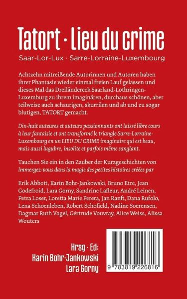 Achtzehn mitreißende Autorinnen und Autoren haben ihrer Phantasie wieder einmal freien Lauf gelassen und diese Mal das Dreiländereck Saarland-Lothringen-Luxemburg zu ihrem imaginären, durchaus schönen, aber teilweise auch schaurigen, skurrilen und ab und zu sogar blutigen, TATORT gemacht. Dix-huit auteures et auteurs passionnants ont laissé libre cours à leur fantaisie et ont transformé le triangle Sarre-Lorraine-Luxembourg en un LIEU DU CRIME imaginaire qui est beau, mais aussi lugubre, insolite et parfois même sanglant. Tauchen Sie ein in den Zauber der Kurzgeschichten von Immergez-vous dans la magie des petites histoires créées par Erik Abbott, Karin Bohr-Jankowski, Bruno Etre, Jean Godefroid, Lara Gorny, Sandrine Lafleur, André Leinen, Petra Loser, Loretta Marie Perera, Jan Ranft, Dana Rufolo, Lena Schoenleben, Robert Schofield, Nadine Soerensen, Dagmar Ruth Vogel, Gértrude Vouvray, Alice Weiss, Alissa Wouters.