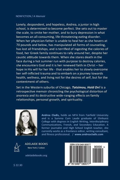 Lonely, despondent, and hopeless, Andrea, a junior in high school, is determined to become perfect. She sets out to master the scale, to smite her mother, and to bury depression in what becomes an all-consuming, life-threatening eating disorder. When her physician-father is unable to heal her as she hovers at 70 pounds and below, has manipulated all forms of counseling, has lost all friendships, and is terrified of ingesting the calories of food, her Greek family continues to rally around her, despite her caustic attitude towards them. When she stares death in the face during a hot summer run with purpose to destroy calories, she encounters God and it is her renewed faith in Christ - her hope in His will for her life - that enables her to slowly overcome her self-inflicted trauma and to embark on a journey towards health, wellness, and living not for the desires of self, but for the contentment of others. Set in the Western suburbs of Chicago, "Tatsimou, Hold On" is a retrospective memoir chronicling the psychological distortion of anorexia and its destructive wide-ranging effects on family relationships, personal growth, and spirituality. An obsession with control, family tension, resistance to cultural norms, grief, and unexpected triumph are predominant themes throughout this memoir. Told in a linear fashion with moments of flashback and foreshadowing to reveal character growth, it is a generative memoir with dynamic characters, a tangible setting, and the pulsing belief that through faith, fitness, and prayer, hope can remain in the cracking fissures of the human heart.