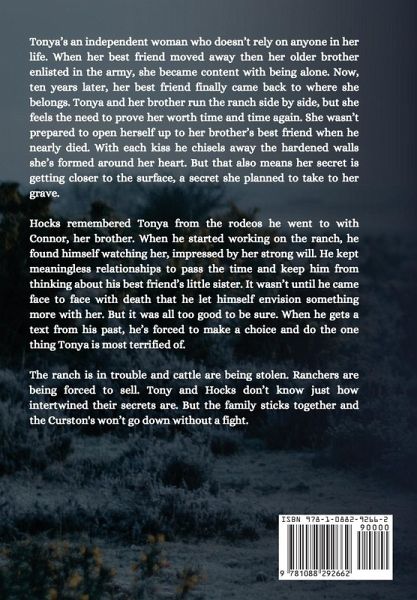 Tonya's an independent woman who doesn't rely on anyone in her life. When her best friend moved away then her older brother enlisted in the army, she became content with being alone. Now, ten years later, her best friend finally came back to where she belongs. Tonya and her brother run the ranch side by side, but she feels the need to prove her worth time and time again. She wasn't prepared to open herself up to her brother's best friend when he nearly died. With each kiss he chisels away the hardened walls she's formed around her heart. But that also means her secret is getting closer to the surface, a secret she planned to take to her grave. Hocks remembered Tonya from the rodeos he went to with Connor, her brother. When he started working on the ranch, he found himself watching her, impressed by her strong will. He kept meaningless relationships to pass the time and keep him from thinking about his best friend's little sister. It wasn't until he came face to face with death that he let himself envision something more with her. But it was all too good to be sure. When he gets a text from his past, he's forced to make a choice and do the one thing Tonya is most terrified of. The ranch is in trouble and cattle are being stolen. Ranchers are being forced to sell. Tony and Hocks don't know just how intertwined their secrets are. But the family sticks together and the Curston's won't go down without a fight.