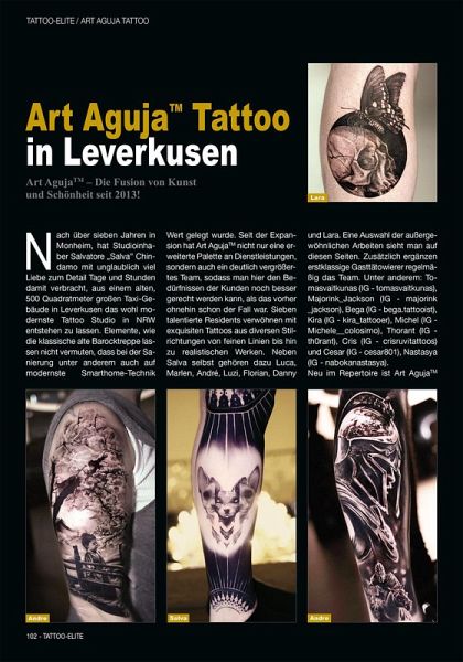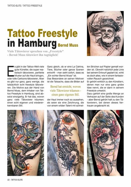 Tätowieren ist Kunst Dieses vierte Buch der Elite beinhaltet erneut eine Auswahl der besten Tattoo-Artists und Studios in Deutschland, die uns aktuell als solche bekannt sind. Es zeigt, dass Tattoo-Artists echte Künstler:innen sind, und welche höchst qualifizierten Kunstwerke sie auf die Haut bringen. Viele werden sich nicht nur in Bezug auf die realistischen Motive sagen, dass es fast unmöglich scheint, so genial zu malen - wie erst ist es möglich, dass solche teils fotorealistisch perfekten Kunstwerke tätowiert werden. Aber ganz gleich, ob Realistic, Oldschool oder Fineline, egal ob monochrom, in Farbe, vollflächig oder in durchweg bizarren Linien, egal ob groß oder klein - die hier gezeigten Tätowierungen sind durchweg der Maßstab für beeindruckend exzellente Qualität. Die Bilder der Arbeiten der Tätowierer und Tätowiererinnen sind von ihnen selbst ausgesucht und vom Verlag unbearbeitet übernommen worden. Unsere vierte Tattoo-Enzyklopädie dieser Art ist ein genialer Fundus für jeden Tattoo-Fan. Außerdem ist sie der Beweis: Tätowieren ist Kunst.